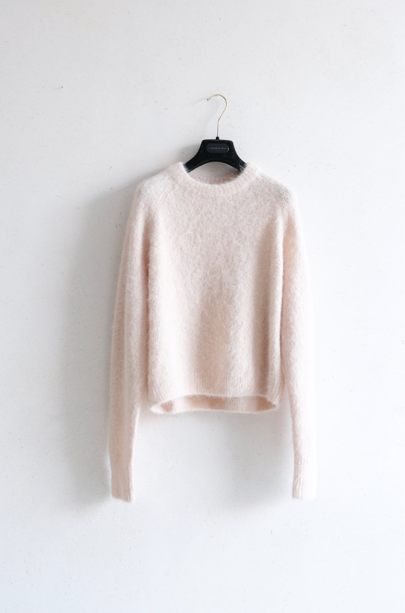 Strikket kort genser med rund hals laget av fluffy og myk alpakkaull. Genseren har raglanermer, ribbestrikket kant ved hals, ermer og hem.