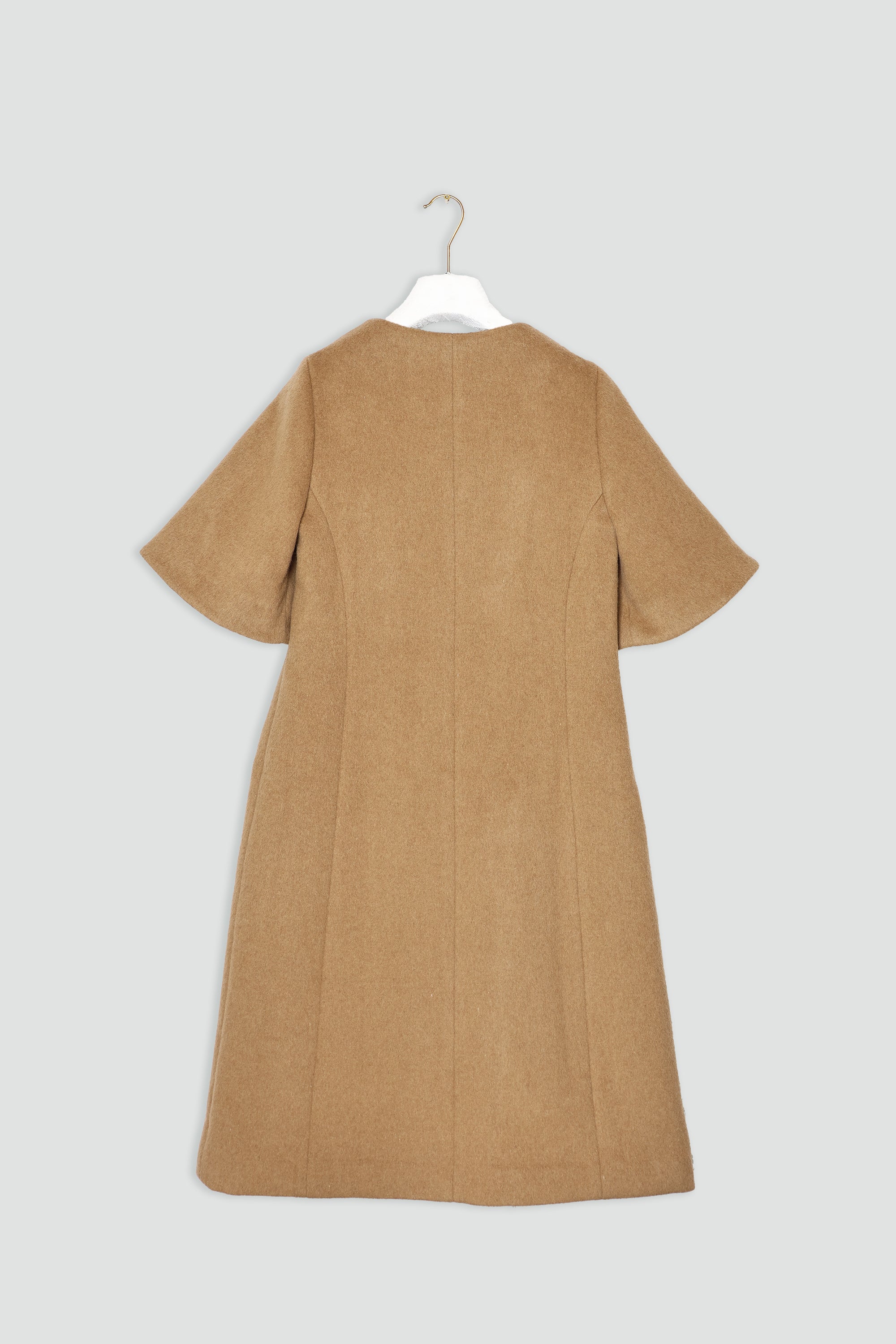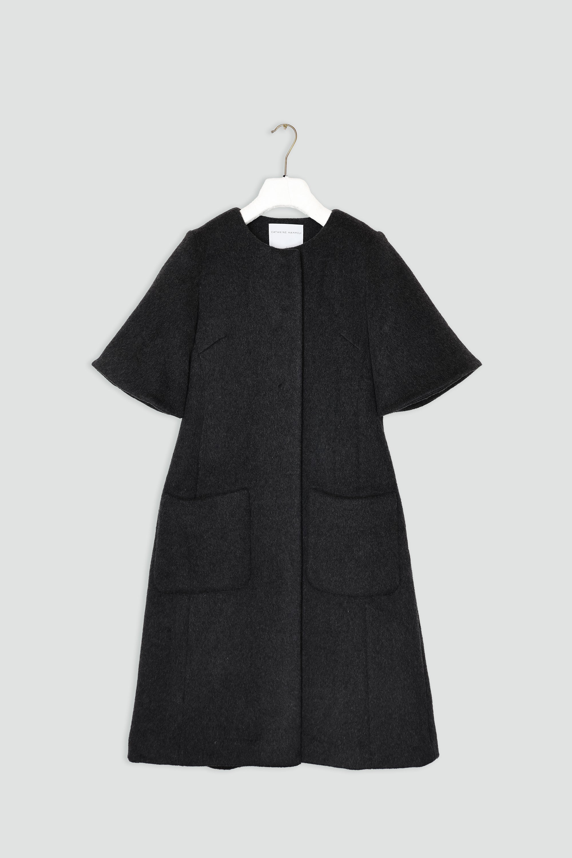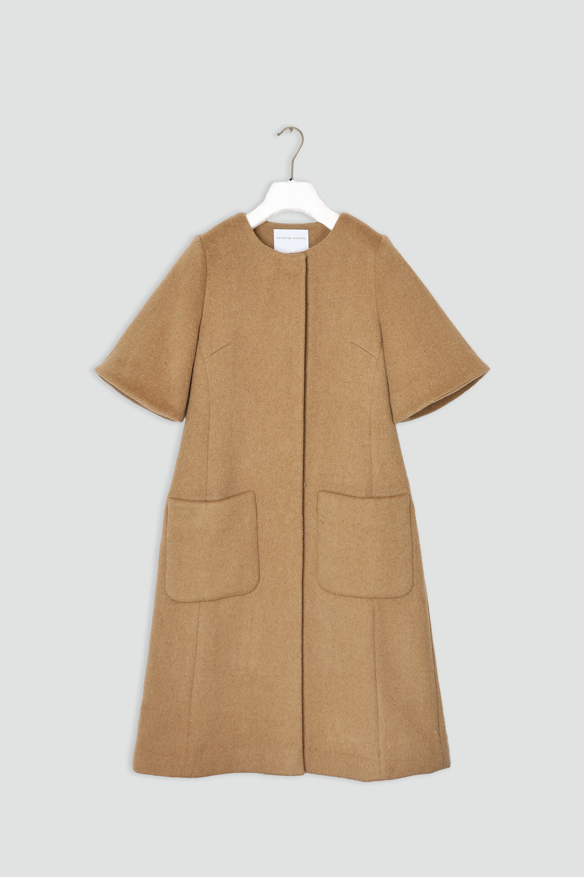 Skulpturert A-linje frakk med korte ermer i en eksklusiv kvalitetsblanding av kasjmir, alpakka og ull. Passformen er innsvinget over overkroppen og lett løs over hoftene.