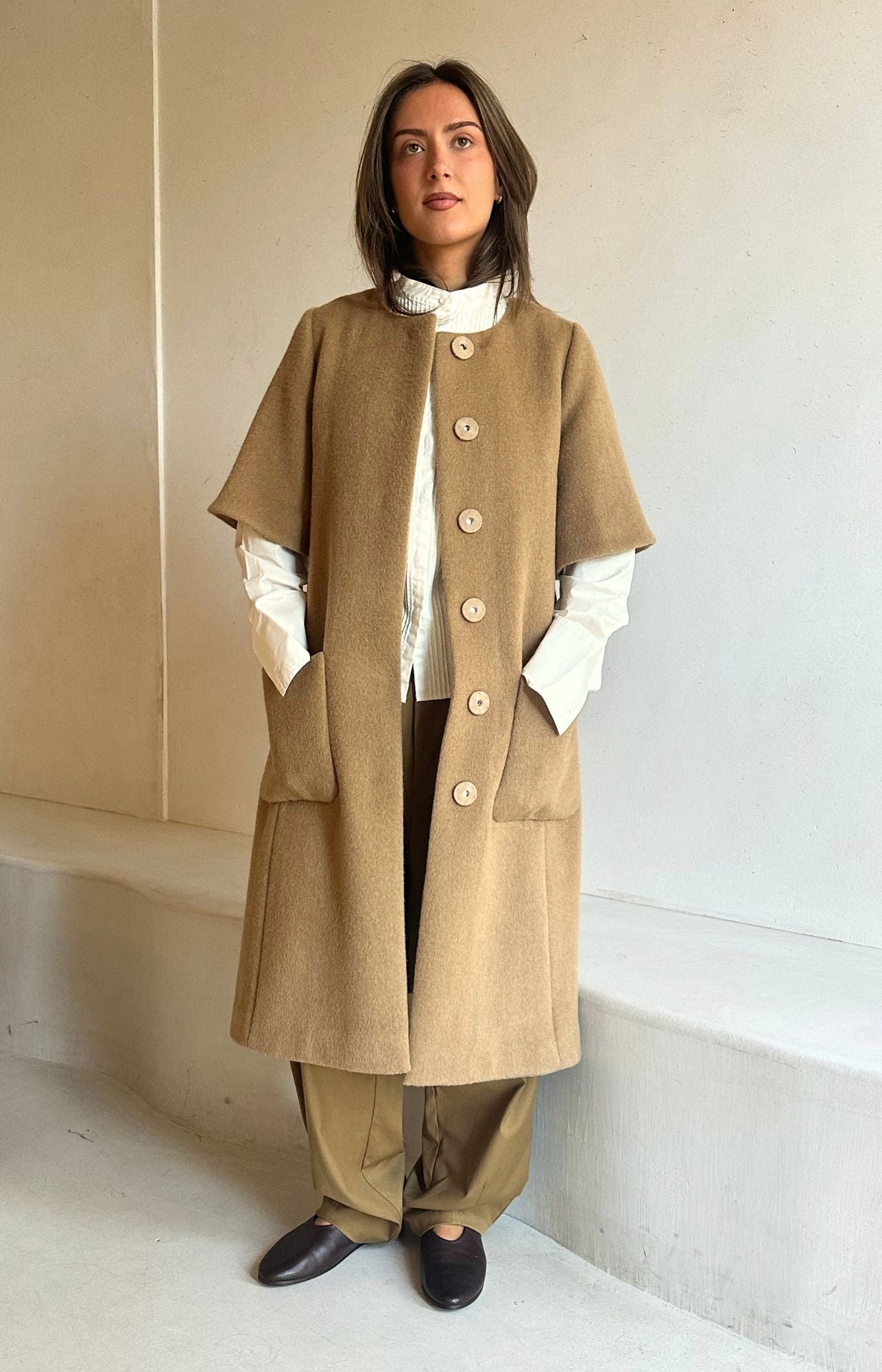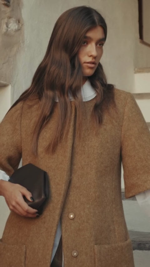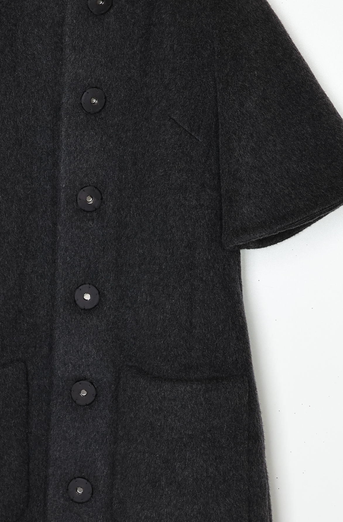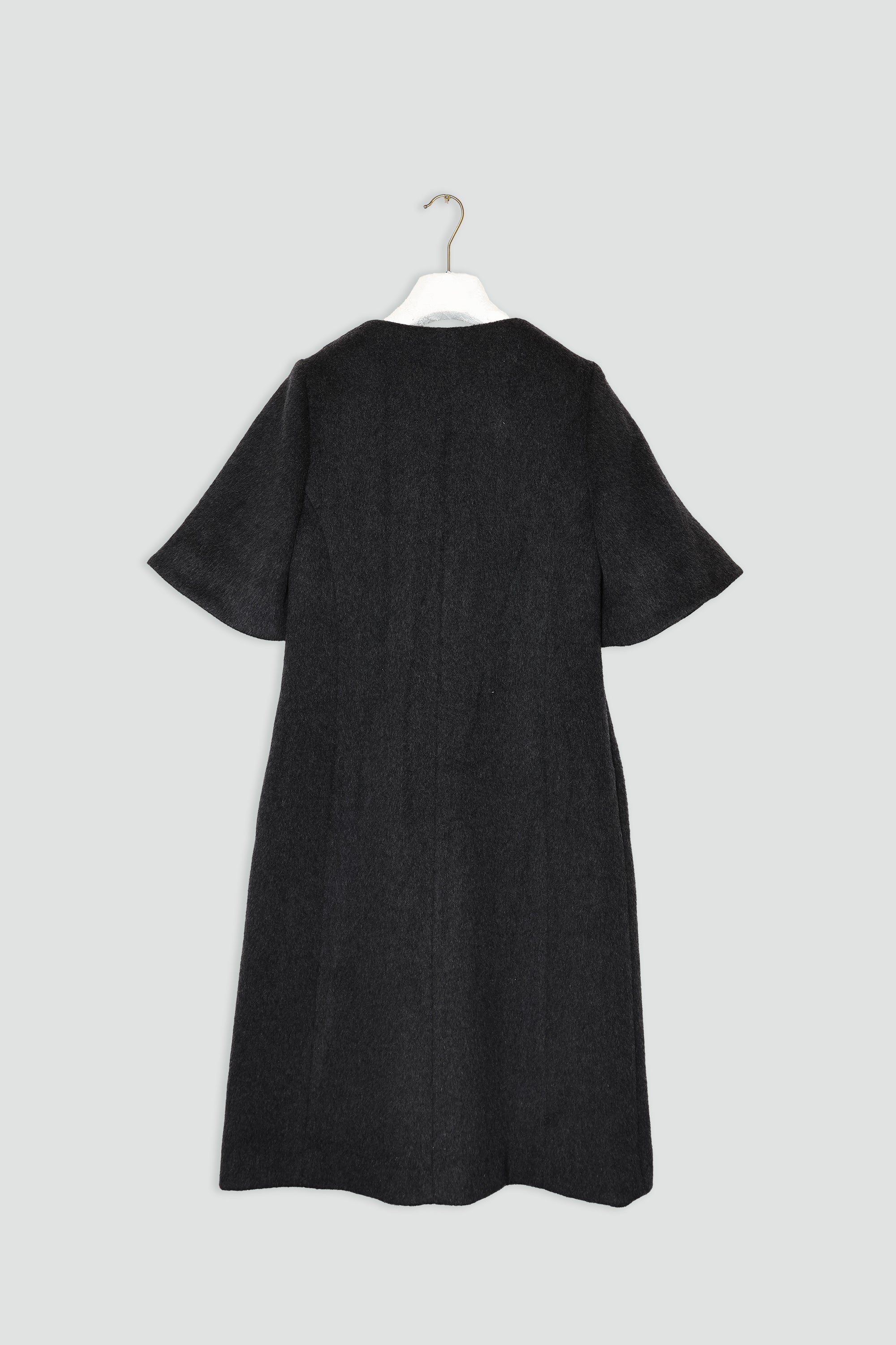 Skulpturert A-linje frakk med korte ermer i en eksklusiv kvalitetsblanding av kasjmir, alpakka og ull. Passformen er innsvinget over overkroppen og lett løs over hoftene.