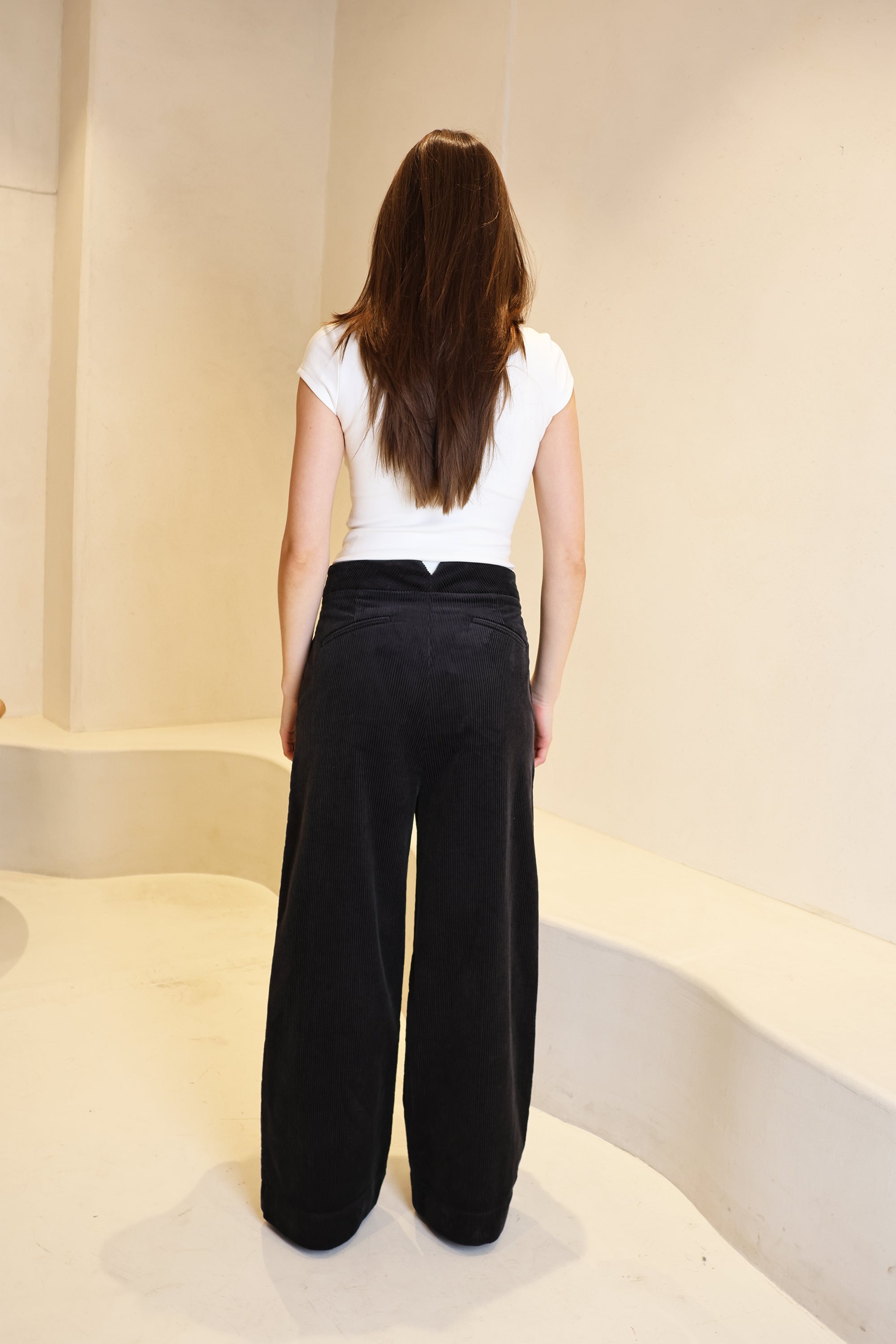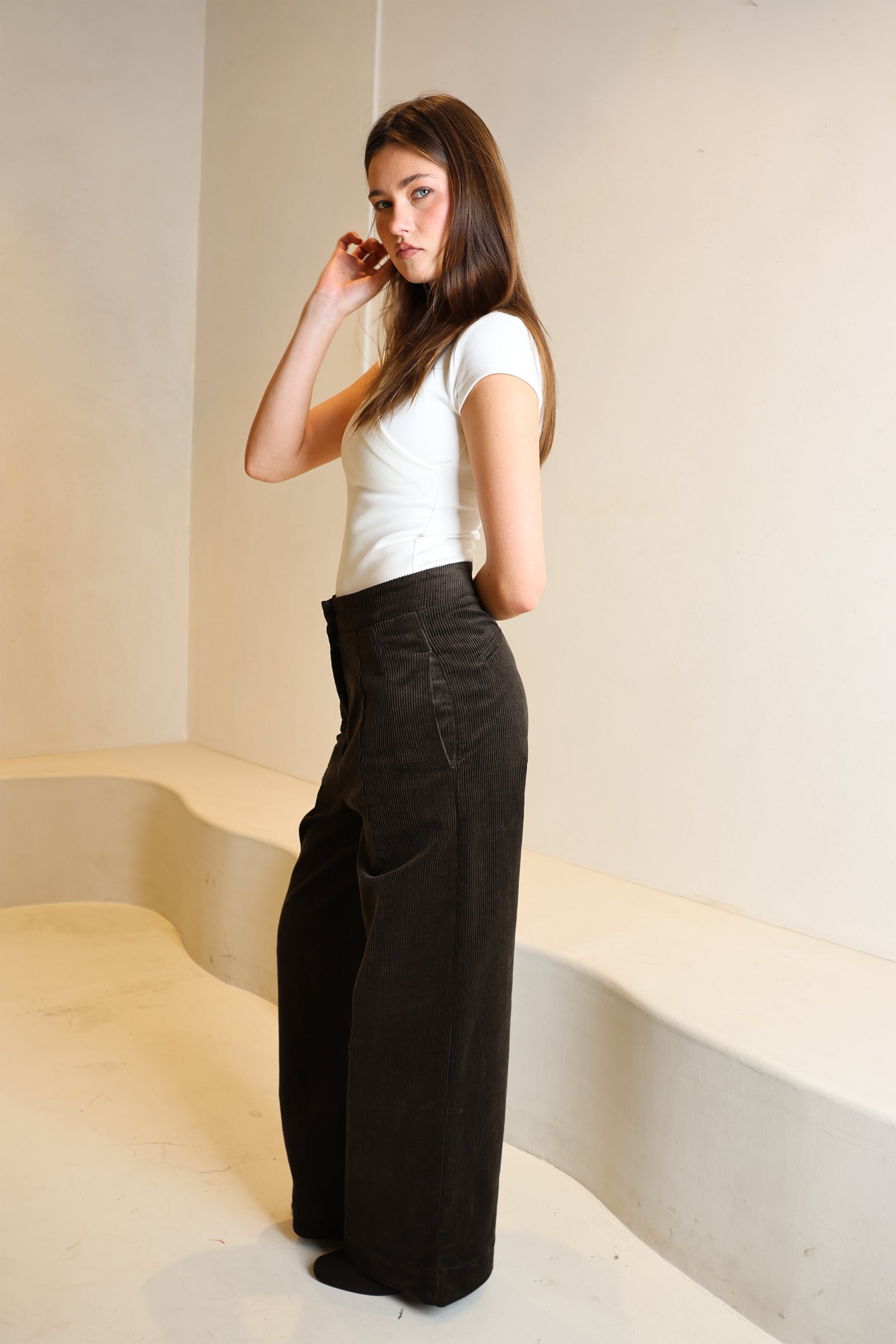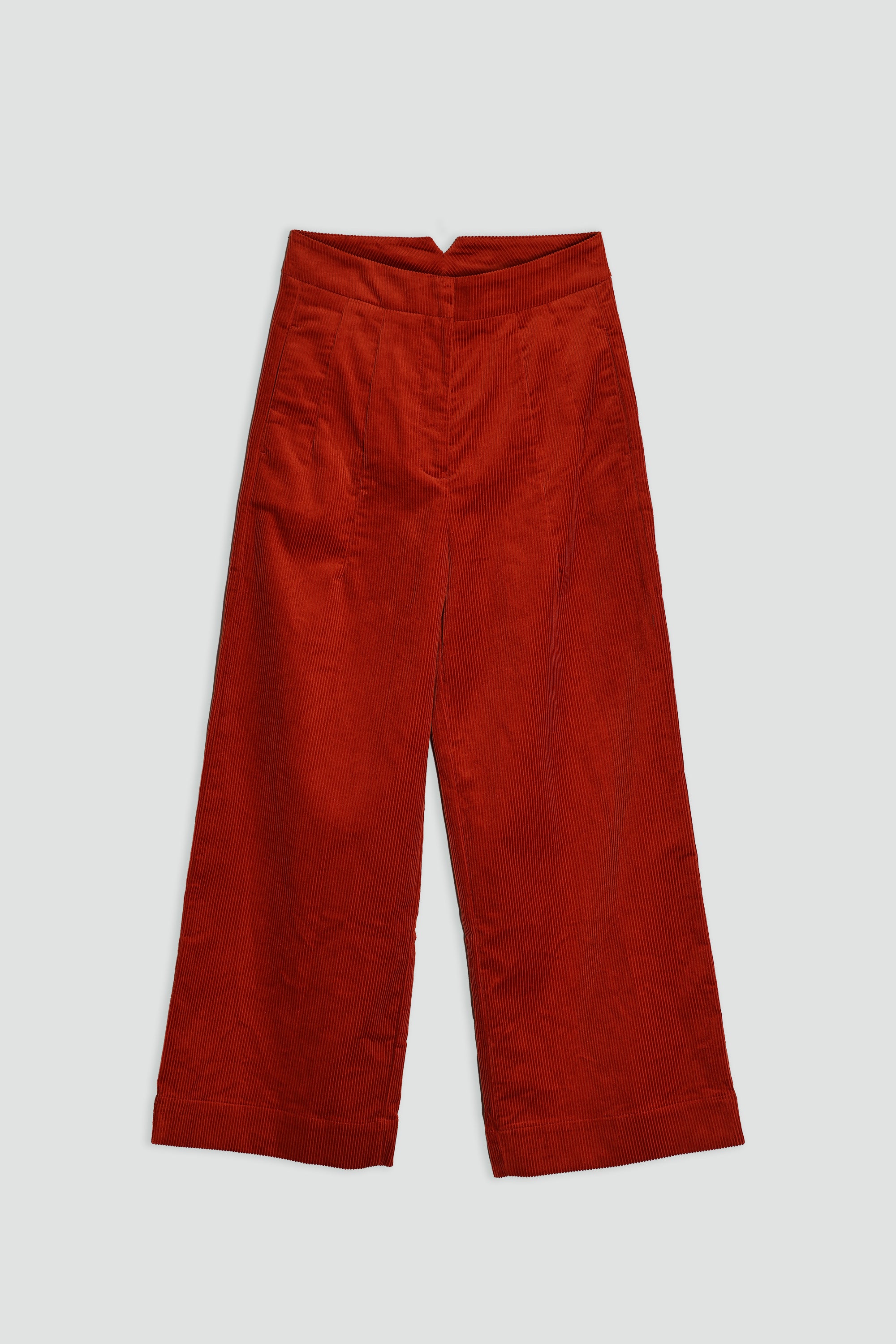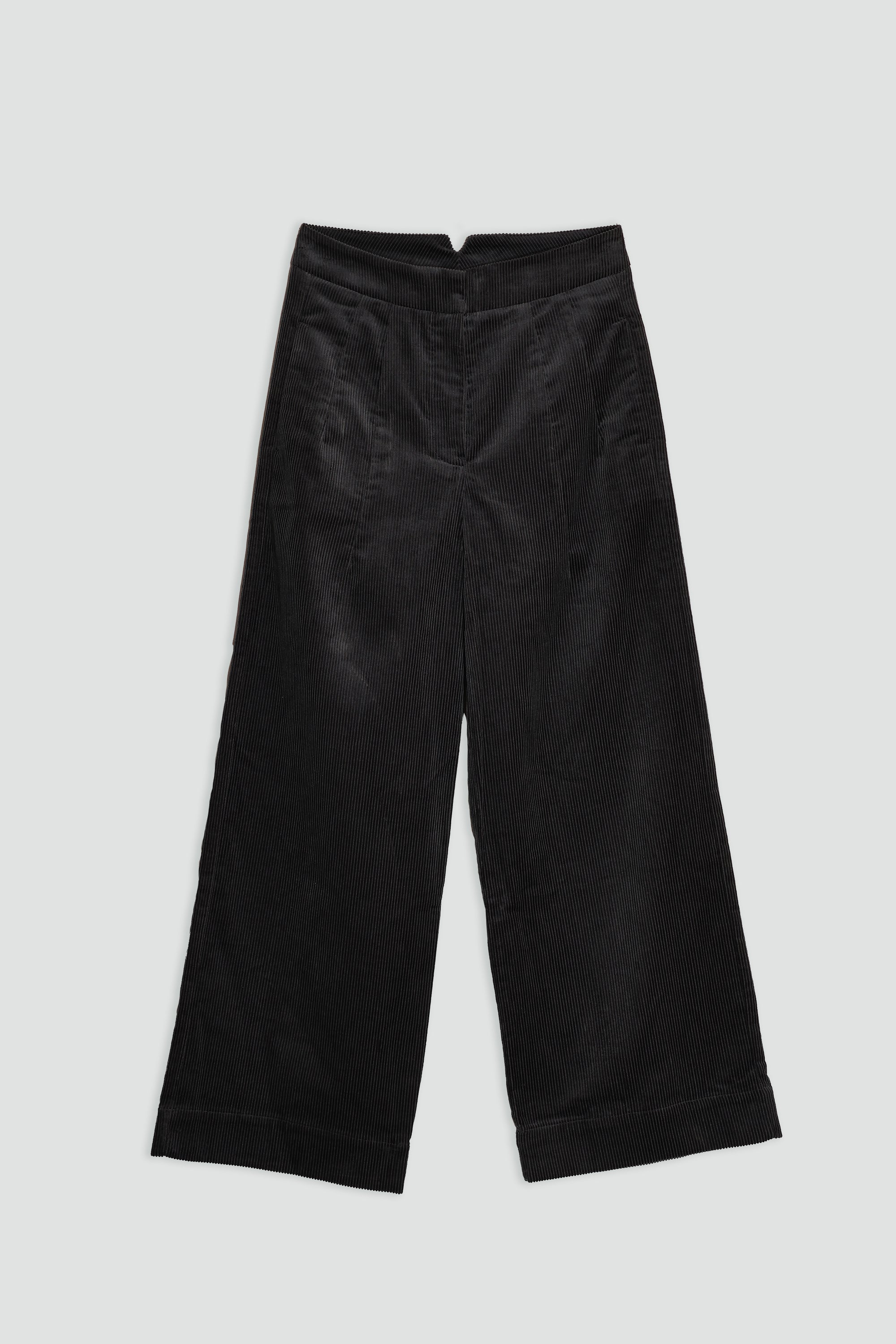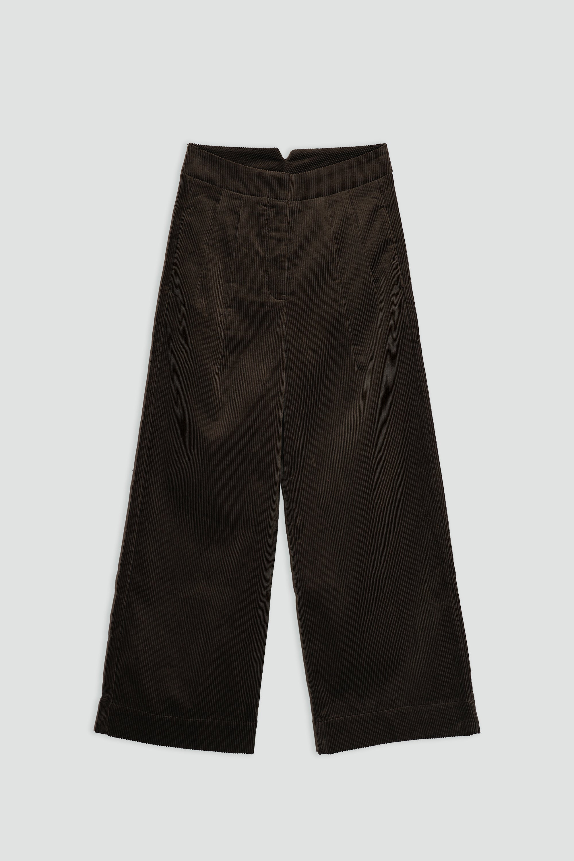 Corduroy pants made from 100% cotton. High Waist Pants er en elegant og allsidig bukse med høy midje og en flatterende A-form. De vide beina gir et sofistikert uttrykk og gjør buksen både komfortabel og stilfull. Buksen har nedsydde legg i front, stikklommer i siden og passepoilerte lommer bak.