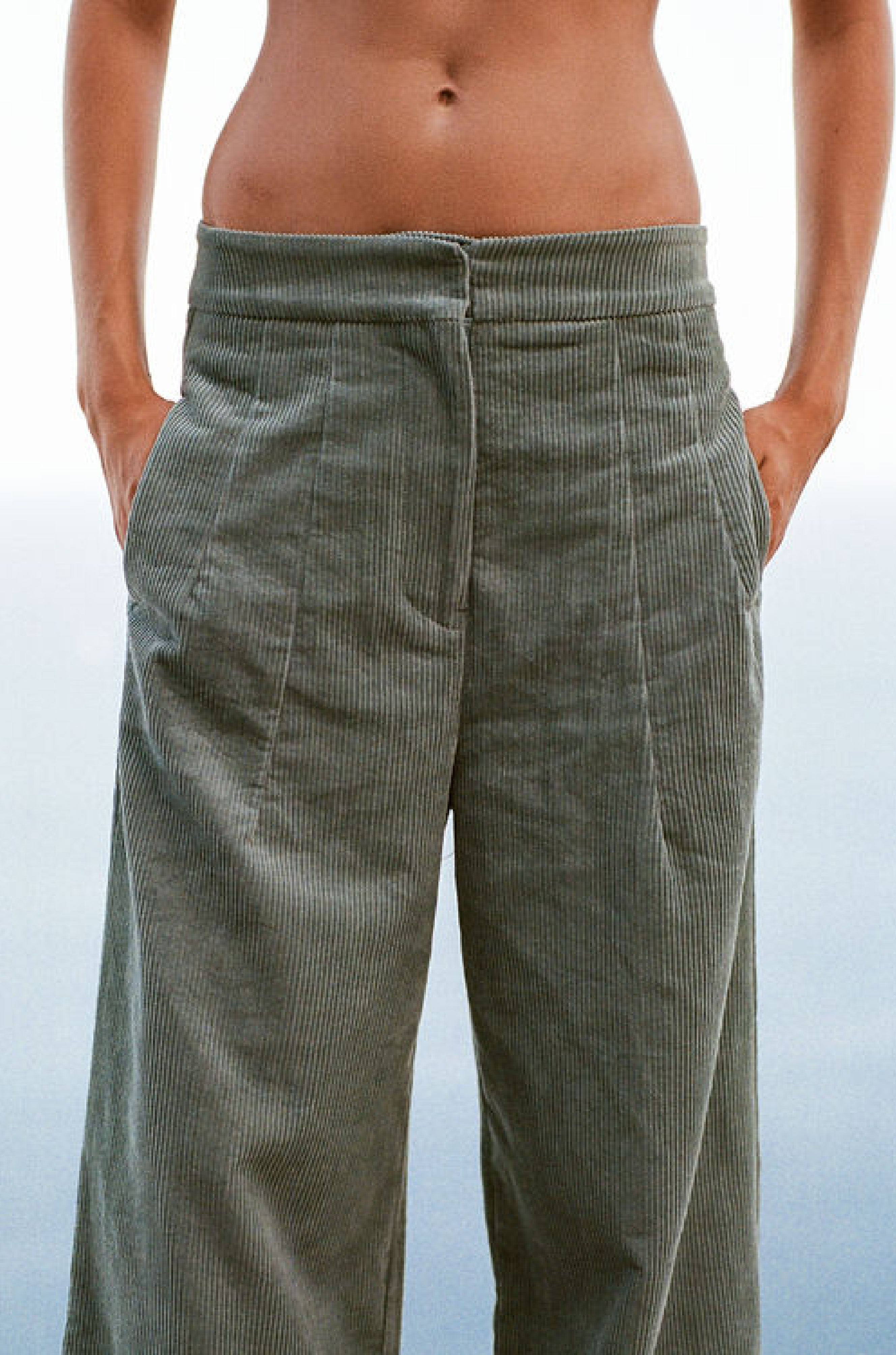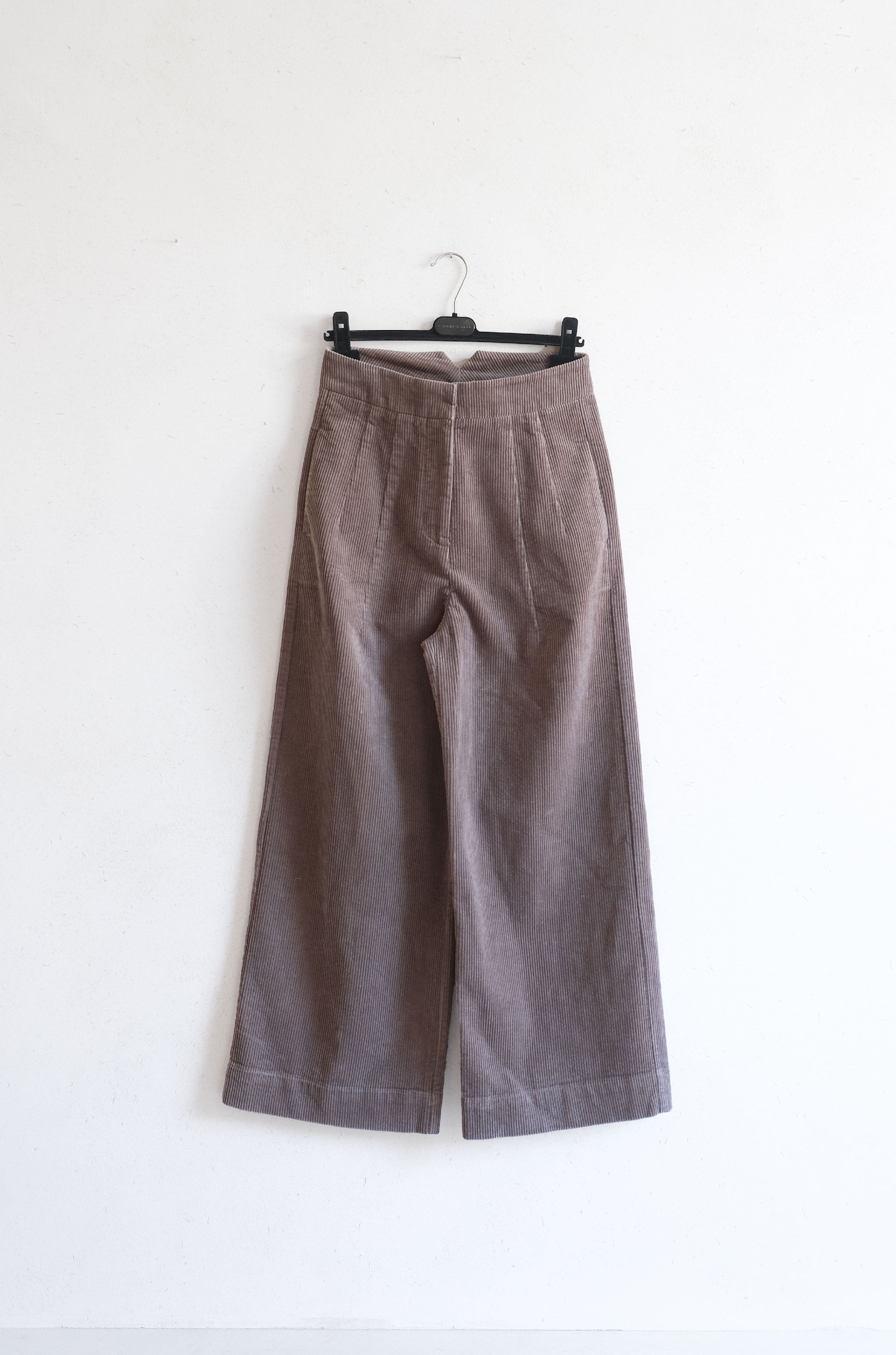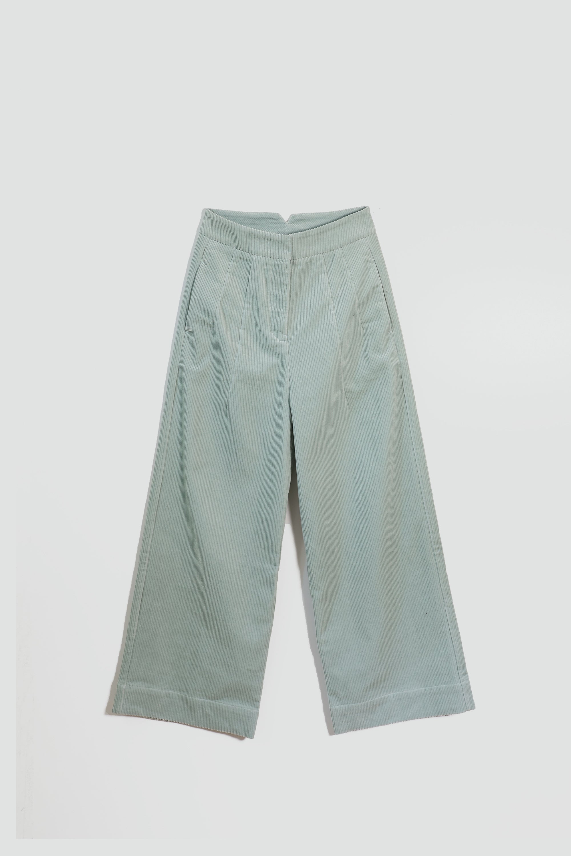 Cordbukser laget i 100% bomull. Buksen er høyt på livet, vie ben, med en bred elastisk linning og eksterne sidelommer. Buksen har en elegant avslappet silhuett.