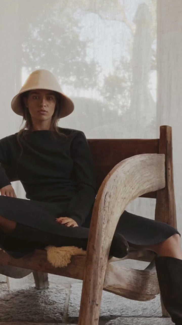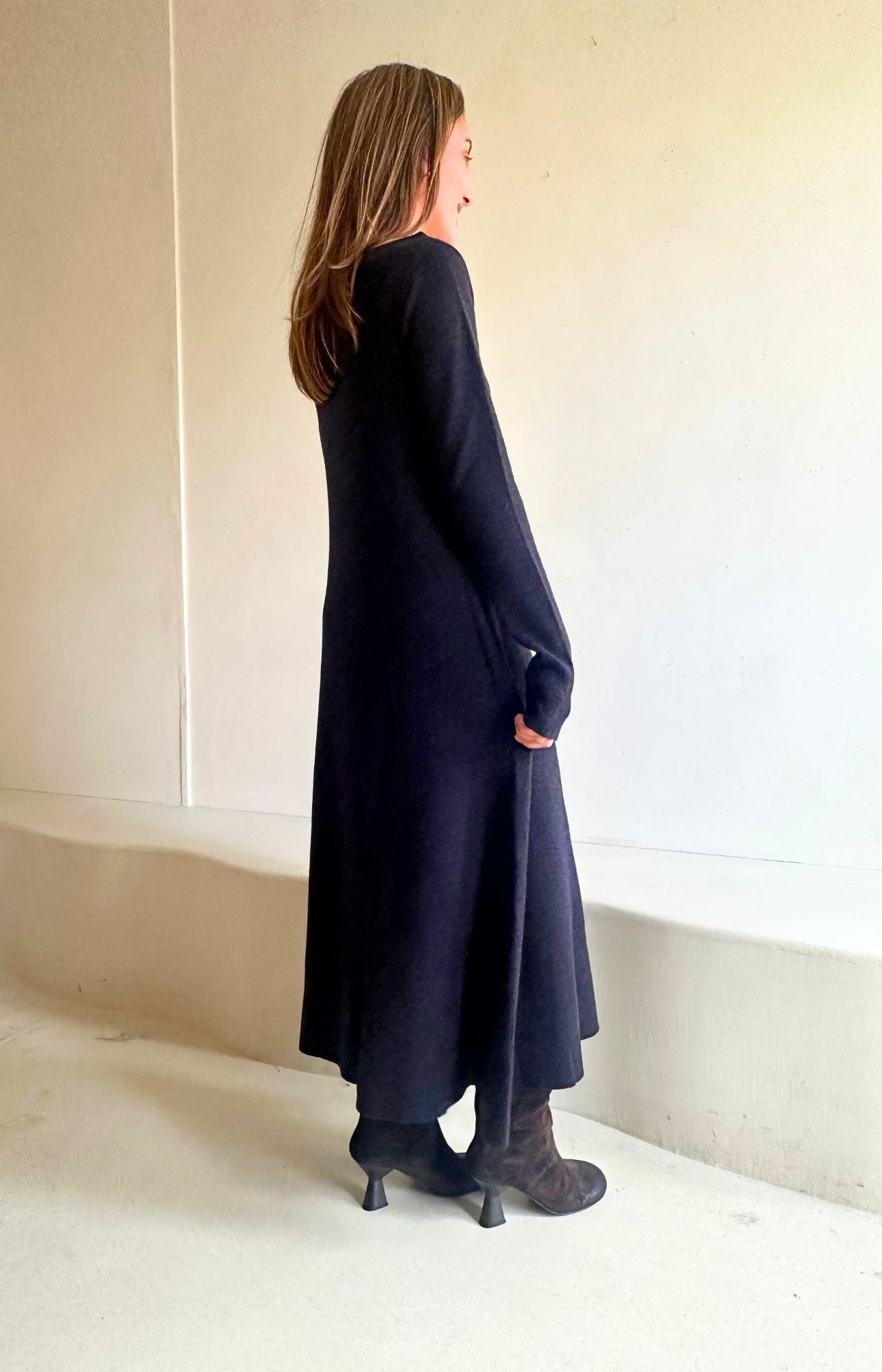 Denne lange kjolen i 100 % merino er sofistikert nok til kveldsbruk med et oppkledd uttrykk, men kan også brukes som et hverdagsantrekk. Den botaniske åpningen gir et elegant preg. Passformen er smal og figurnær øverst på kroppen, med smale ekstra lange ermer for et moderne uttrykk. Fra bryst til hofter er passformen smal, men ikke stram. Fra hoftene og ned har den en lett A-linje. Fasongen på kjolen er smal, men ikke avslørende.