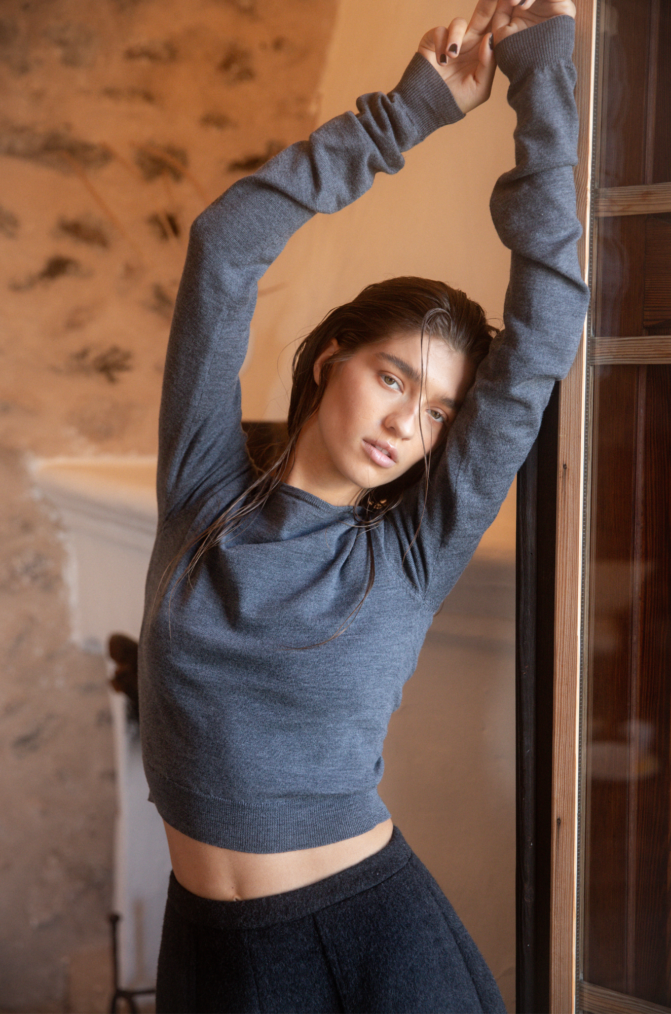 En lett og luksuriøs genser i 100 % merinoull, designet med en elegant boatneck som fremhever skuldrene på en subtil og sofistikert måte. Genseren har en smal, kroppsnær passform med sittende ermavslutninger og en lett innsvinget midje som skaper et balansert og feminint uttrykk.