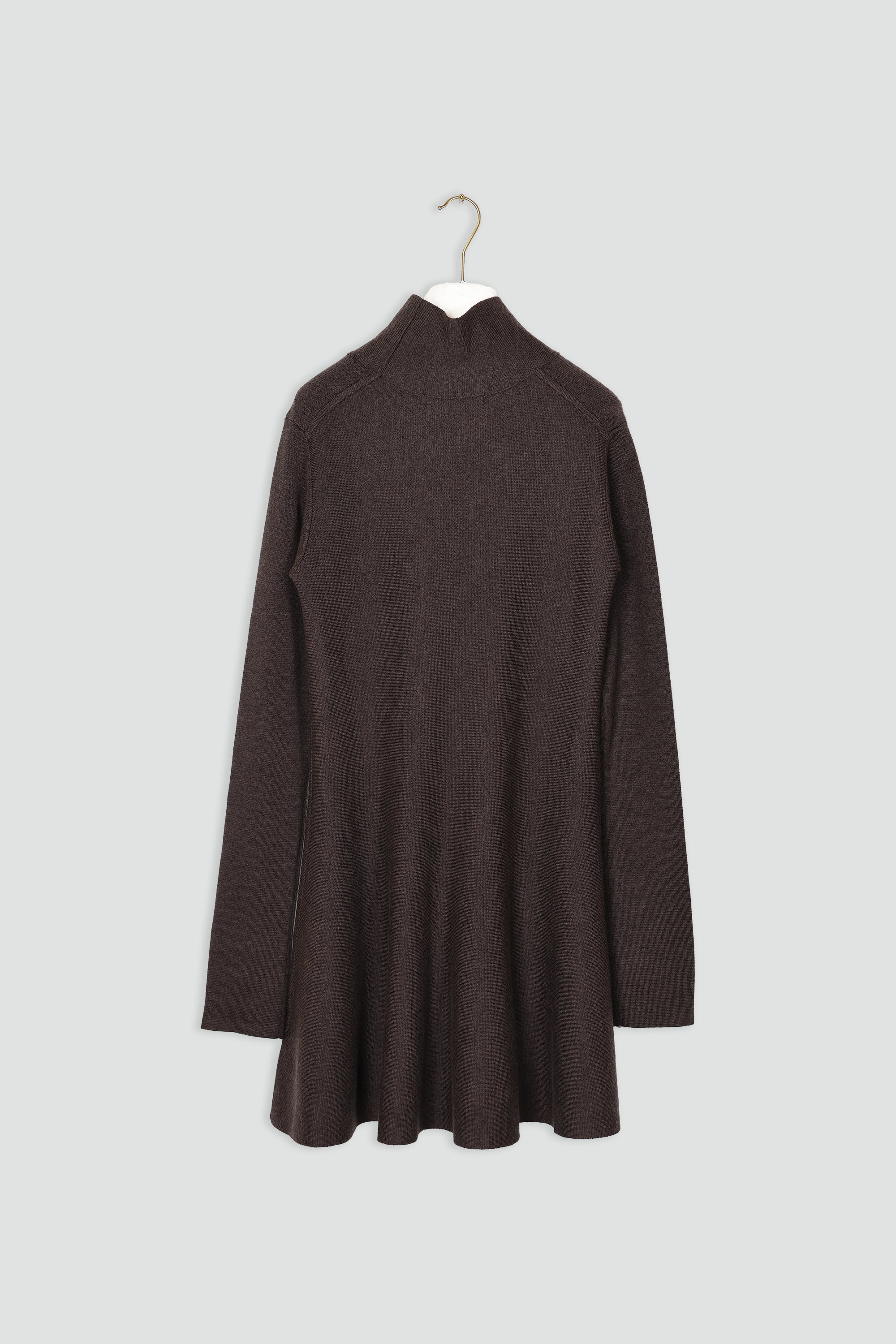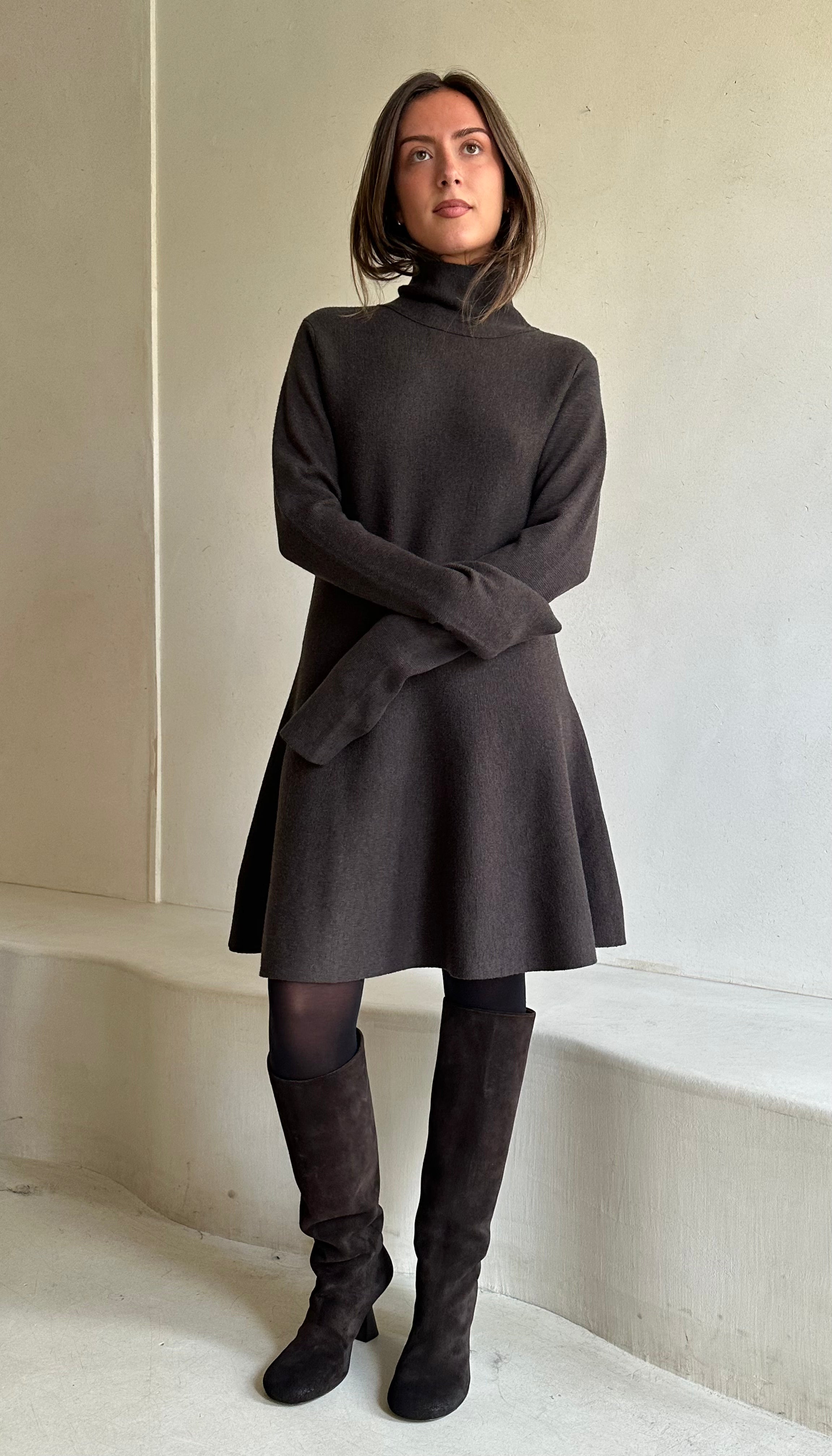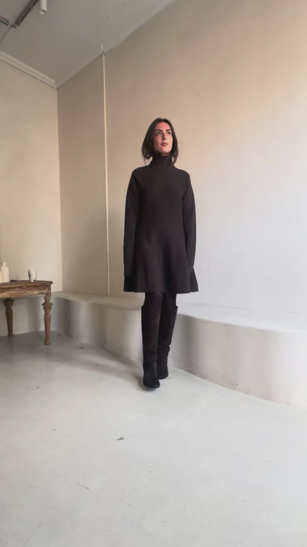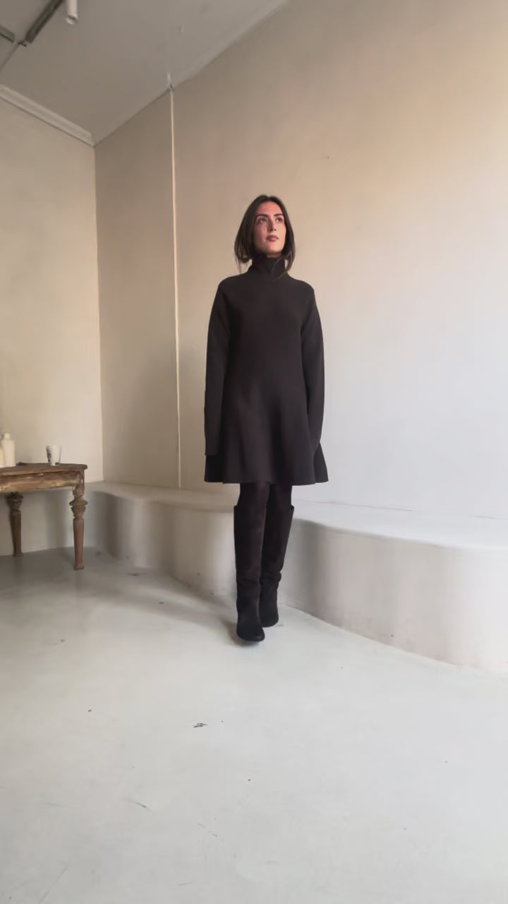 Den er ikke tettsittende over mage og hofter, men faller lett med litt ekstra vidde i skjørtet. Kjolen har en perfekt høy hals som ikke sitter stramt, men gir kjolen et moderne og kraftfullt uttrykk. Dette er den perfekte hverdagskjolen eller aftenkjolen for et moderne og sofistikert uttrykk.
