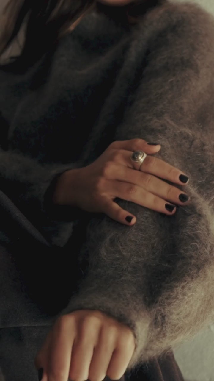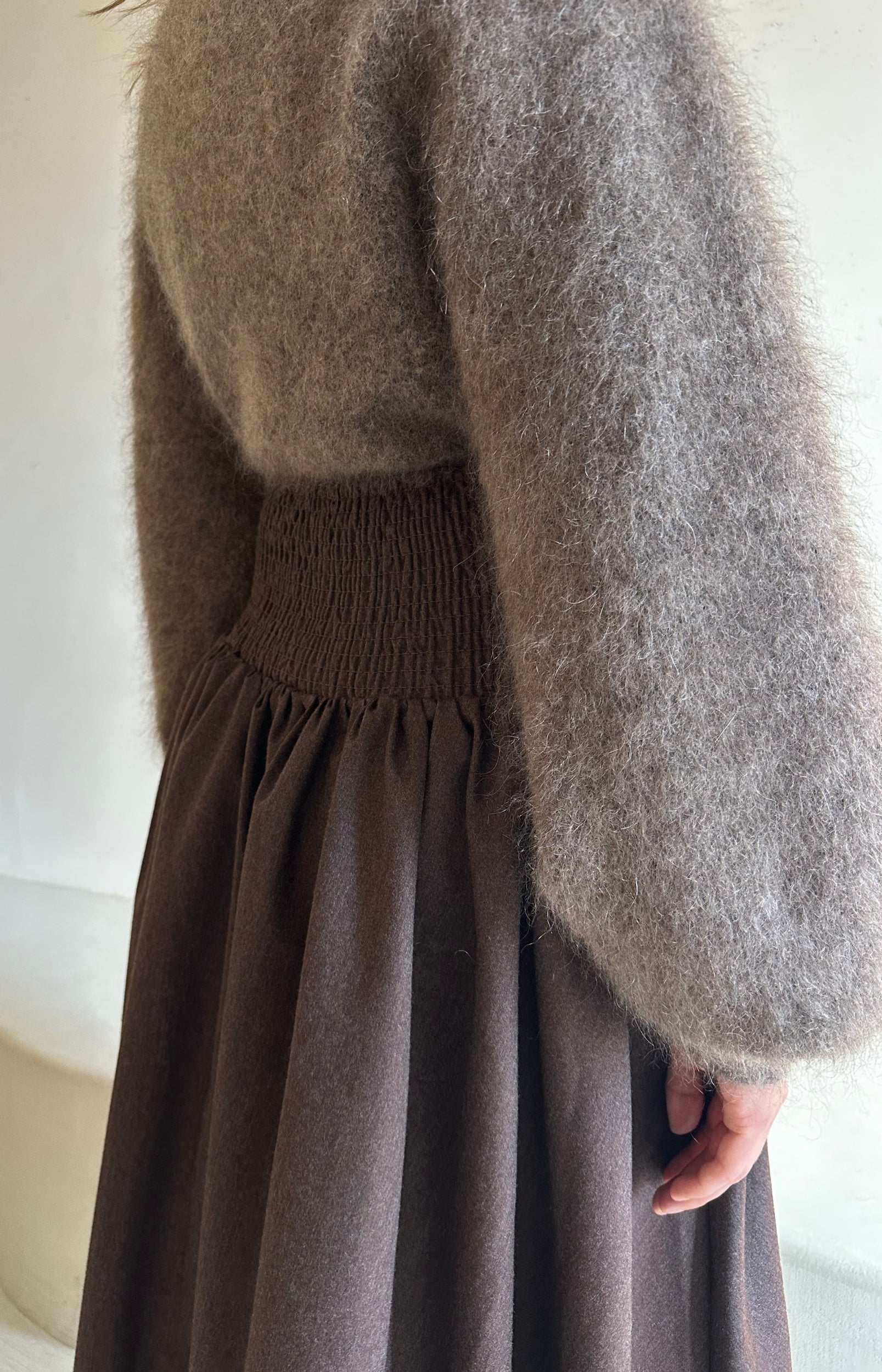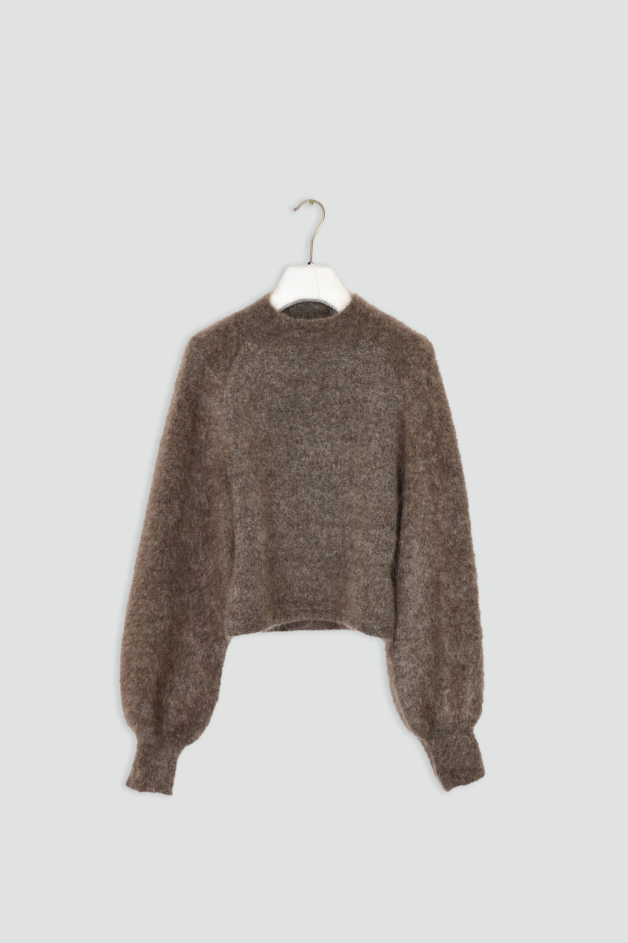 Denne genseren vil dekke de fleste behov. Den tidligere kvalitetsblandingen med 72 % mohair er den mykeste og mest eksklusive i vår historie. Den har et fluffy uttrykk – uten at den mister hår. Fasongen på bolen er petit, men ikke tettsittende, lengden går til livet og er spesielt laget for våre bukser og skjørt. Genseren har vakre ballongermer for et ekstra blikkfang. Halsen har en halv høyhalset åpning.