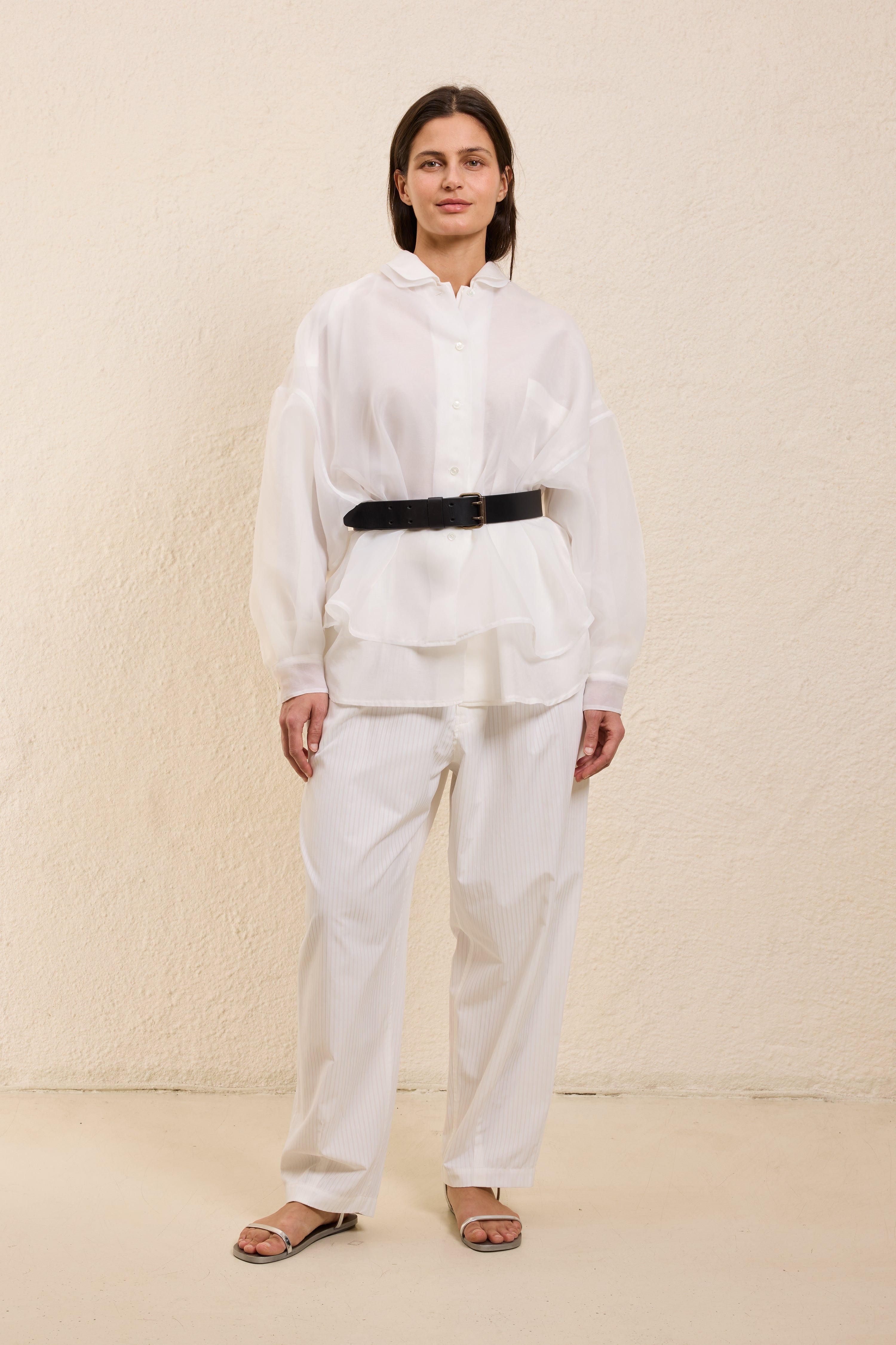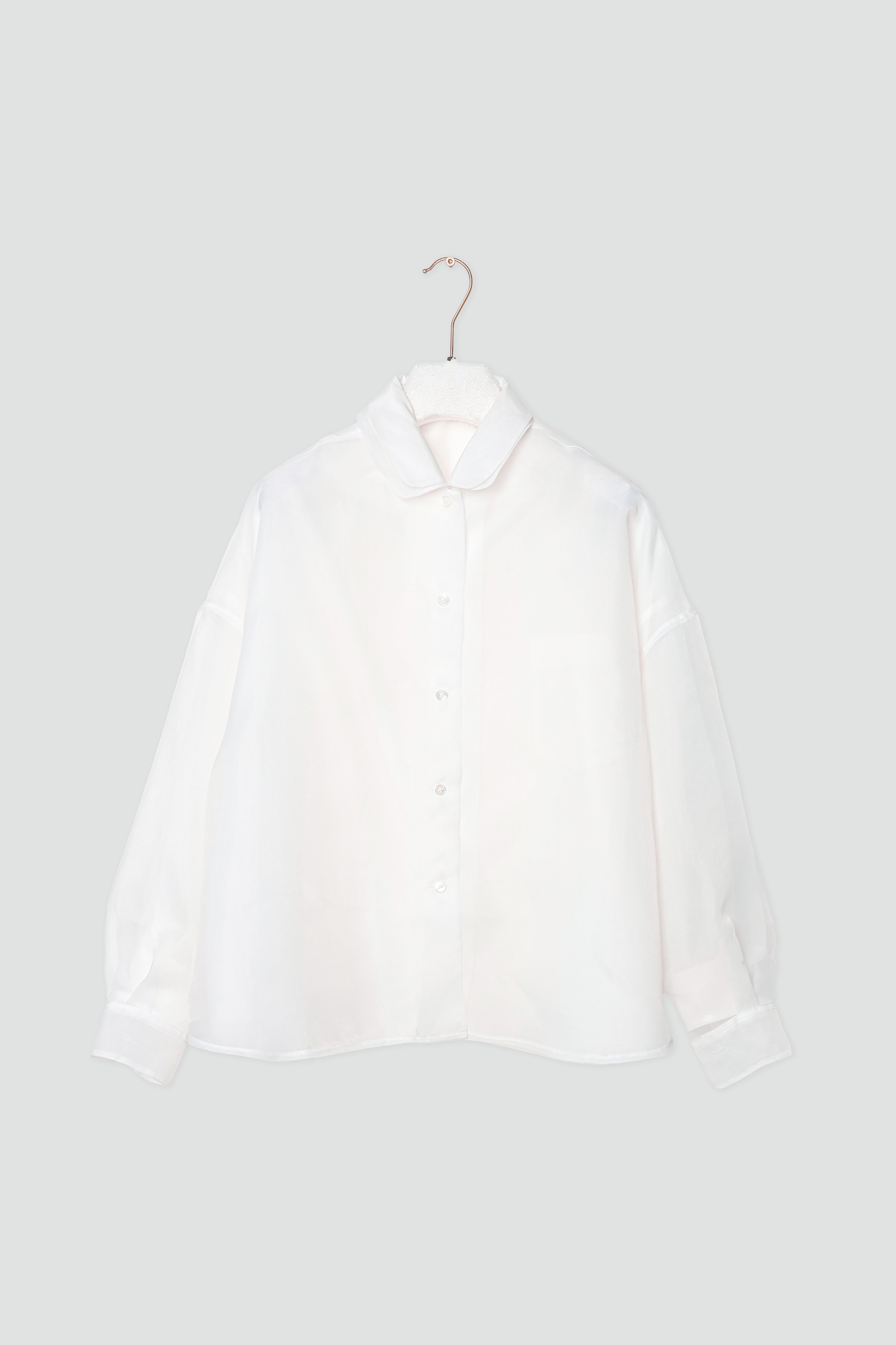 Designet som to skjorter i én, kombinerer den et mykt innerlag med et transparent organza-lag som beveger seg uavhengig av kroppen. Den doble konstruksjonen skaper dybde i kanten nederst og et subtilt volum i ermene. Avsluttet med krage og knapper foran, føles den velkjent i formen, men luftig i uttrykket. Bruk et belte i livet for mer definisjon, eller la den henge løst slik at lagene faller fritt.