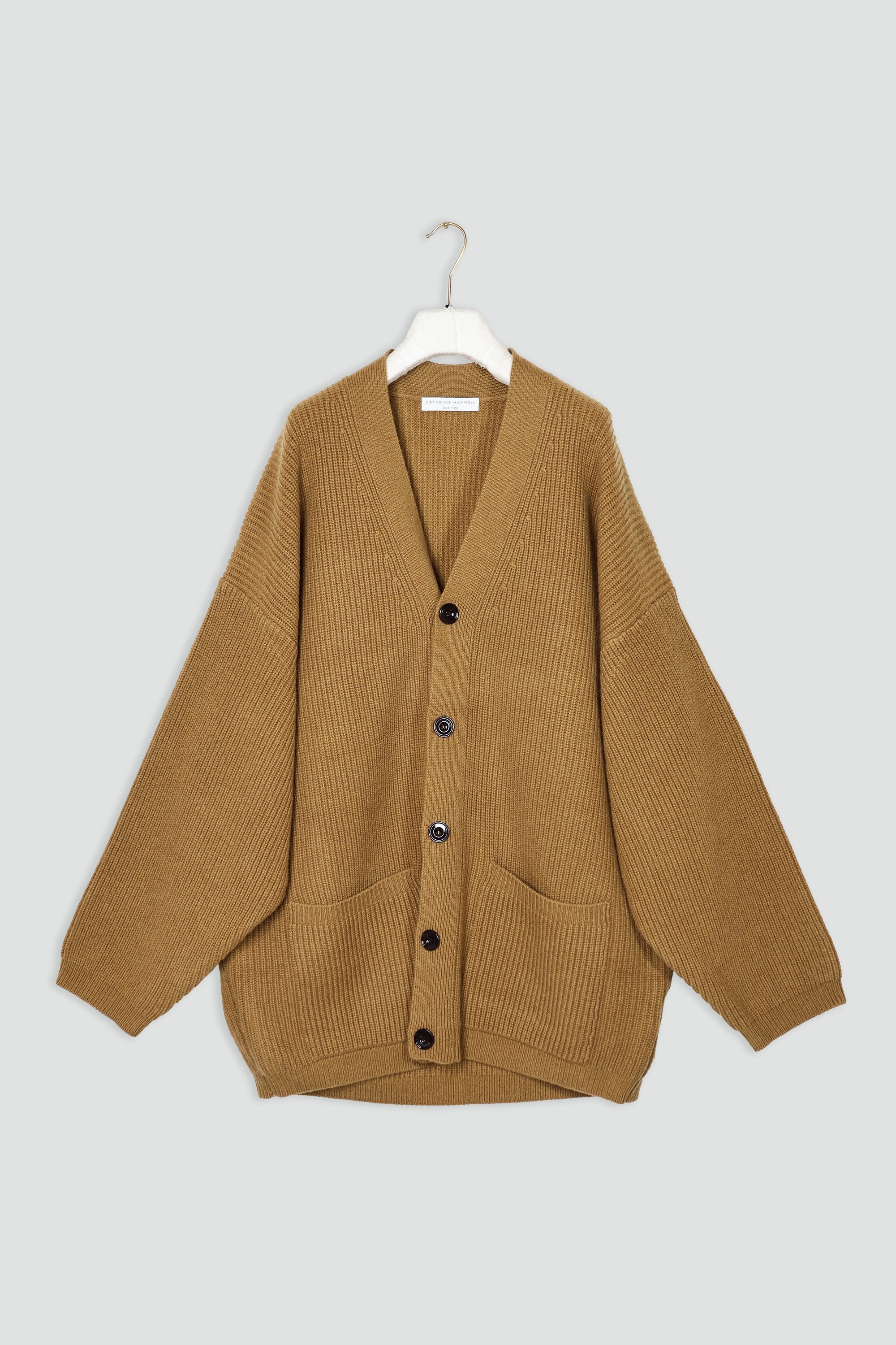 Ultramoderne, oversized ribbestrikket cardigan. Med lommer og benknapper.