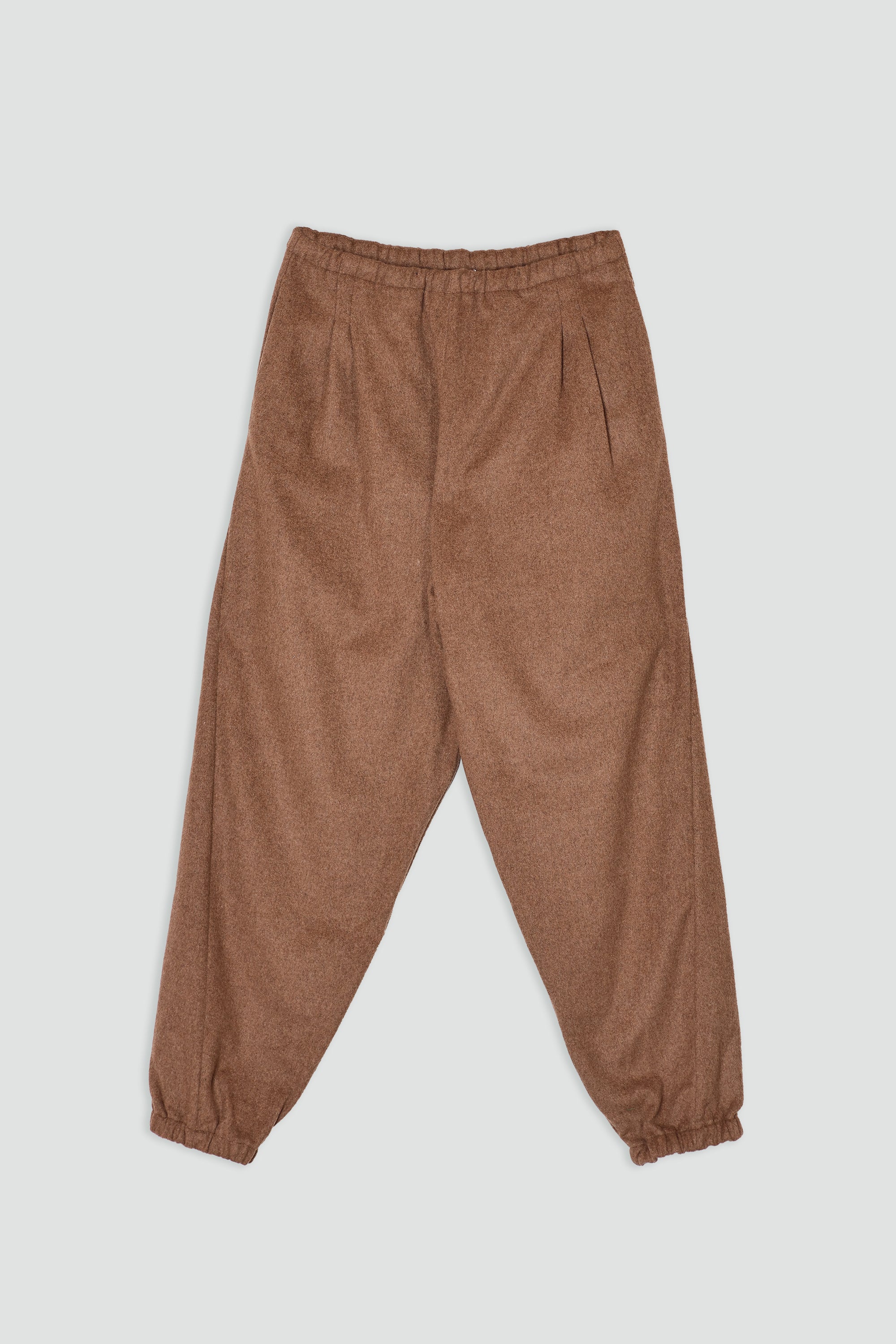 Relaxed-fit wool trousers designed with a soft elastic waistband and an adjustable drawstring. The Wool sweatpants offers a customizable fit for all-day ease. Gentle pleats at the waist add subtle volume, while the tapered legs with adjustable tie cuffs create a versatile silhouette that can be styled casually or dressed up.